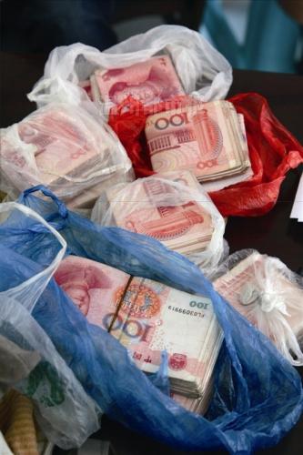 昨天,在平阳县公安局鳌江派出所,桌上放着阿路平日里带在身上的近10万元现金。