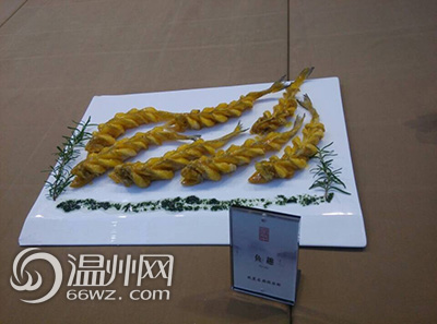 百鱼宴第一道——香蕉黄鱼夹,由瓯厨冯旭辉制作完成。由全省百余位名厨共烩的百鱼宴将有两项内容(108道菜/108人)申报世界基尼斯之最。 (记者 陈克力)
