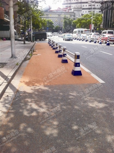 “路面采用进口抗滑耐磨的陶瓷颗粒材料,这种材料从里到外都有颜色,所以不会因为磨损就褪色。”承担本次改造工程施工任务的市市政工程建设开发公司总经理傅静刚介绍,施工队将在12个路段的路口铺设5-10米长,厚度约4毫米的块状自行车道,并画上标示,以达到提示作用。对于一些缺乏隔离绿化带的路段,还将设立隔离栏隔离机动车道。