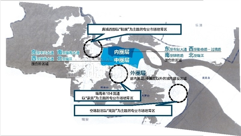 根据温州城市整体规划的要求,主城区专业市场的规划,将主城区划分为内圈层、中圈层和外圈层三大块。
