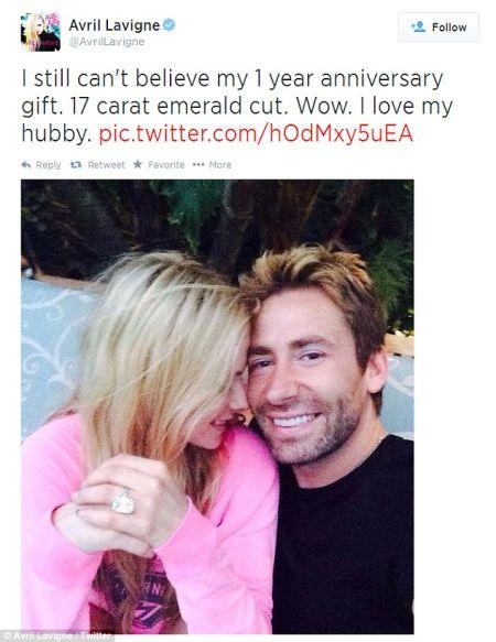 2012年8月8日,37岁的克罗格向艾薇儿求婚,求婚钻戒就有14克拉。艾薇儿接受了查德的求婚钻戒。在克罗格求婚之后,艾薇儿家人表示:“他能够令艾薇儿幸福。我们两边的家庭都对于这场婚姻非常的激动与满意。”艾薇儿与克罗格在2013年7月1日在法国低调结婚。