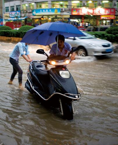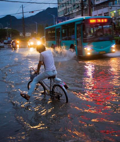 温州网讯 昨天,温州市区已有部分路段积水。昨天下午6点,记者在瓯海区瞿溪街道三溪路与万超路交叉口,发现一段长约300米、最深处达30公分的积水。