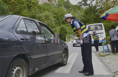 下午1时30分,记者从报社出发,沿瓯越大桥进入S223省道驶往楠溪江风景区,一路过瓯北、上塘并无发现车辆拥堵;到了下午3时,记者从三车道进入单车道上,明显感觉车流量增加,但未产生拥堵。记者发现,凡单车道上,每隔百米便有交警指挥交通,其中车流量最大的九丈大桥上,几乎每隔50米便有一名交警执勤。