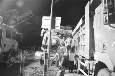前面货车一停车后面货车撞上来 车头挤压司机被困