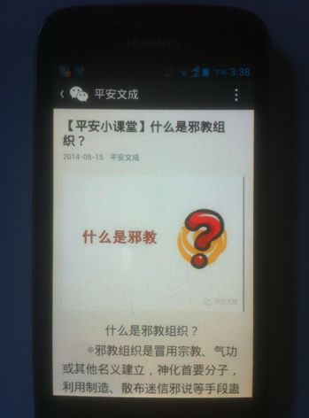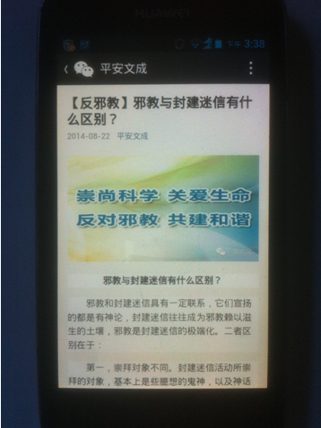 文成县着力创新反邪教宣传新路子,积极探索现代媒体传播的新形式,充分利用微信方便、快捷、互动等功能。近日县委防范办在“平安文成”微信公众平台设置了反邪教栏目,通过“反邪教”栏目向微信用户发送反邪教知识及相关信息。通过微信平台传播反邪教知识,这种宣传方式充分发挥微信传播速度快的优势,增强反邪教宣传的覆盖面和有效性,同时进一步与手机微信用户接近距离,提高群众知邪、识邪、拒邪、反邪的能力。