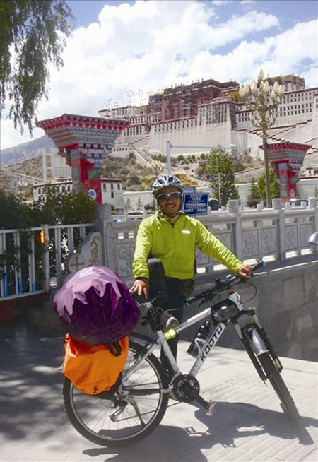 高强度的骑行刚开始时,薛建东身体很不适应。没多久,握着车把的两只手掌就被磨肿,屁股、大腿也被座椅磨得脱皮流血。经浙江、湖北、重庆、四川,他一直骑行到西藏。“一路上不断结识同行的驴友,等骑到西藏的时候就有朋友对我说,既然你都已经骑了这么远了,为什么不干脆环行中国?”