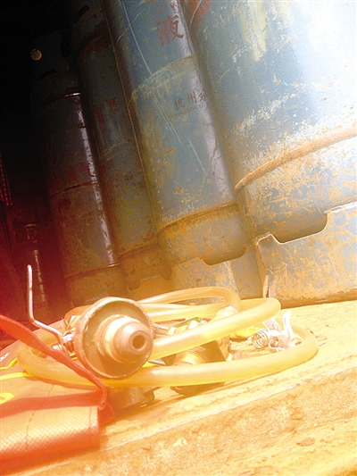 9月15日,在市区梧田原禽蛋市场后的停车场里,记者发现一个铁皮屋,屋内一名中年男子正在用一根皮管,连接一个中型煤气钢瓶(50公斤装)和一个家用煤气钢瓶(14.5公斤装)的出气口,依靠两者间的压力差,将大瓶里的煤气导入小瓶中,屋子里没有任何防护措施。