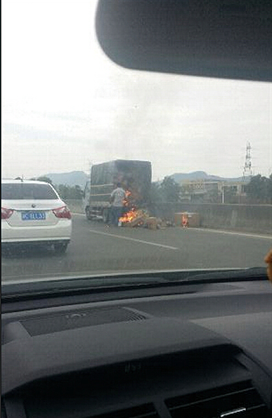 据运输车司机称,他驾驶运输车刚从龙湾出发不久,到达此处时,突然从车后视镜看到浓烟,连忙下车将起火的快递搬到车下。据他统计,运输车里一共装有400多件快件,其中30来件快件被烧毁。