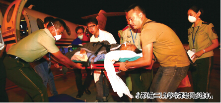 飞机原定于前天下午5时30分起飞,因故延迟半小时,最终于当天下午7时15分到达温州龙湾国际机场。老人在台湾所生唯一的女儿郑爱玲及4名台湾医生随机陪同,老人的二儿子郑佑春等3名亲属前来接机。由于事先已与乐清市人民医院作过对接,该院派出的救护车随即将老人送往该院ICU病房。