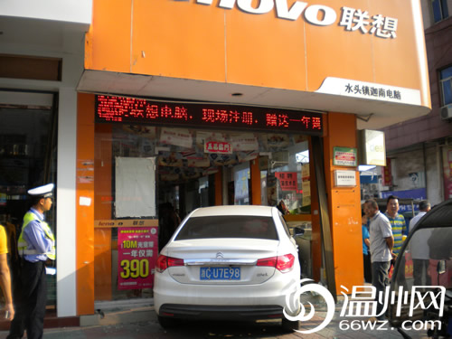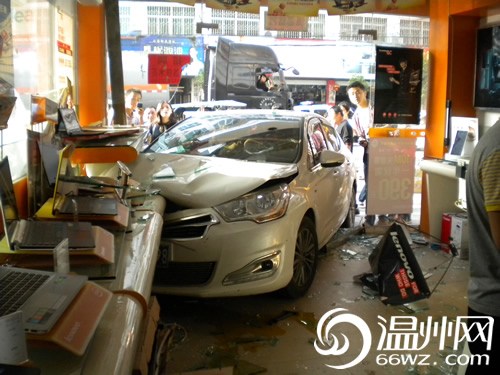 新手女司机误把油门当刹车 车头冲进路边电脑店