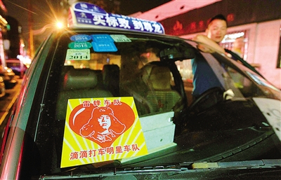 雷锋出租车队的司机将雷锋画像贴在出租车最醒目的位置。