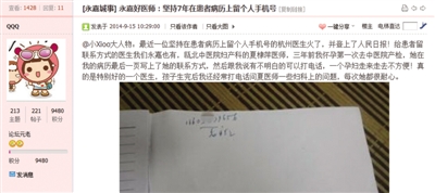 温州网讯 “最近一位坚持在患者病历上留个人手机号的杭州医生火了,并登上了人民日报!给患者留联系方式的医生我们永嘉也有,瓯北中医院妇产科的夏棣萍医师,三年前,我怀孕第一次去中医院产检,她在我的病历最后一页写上了她的联系方式,然后跟我说有不明白的可以打电话,一个孕妇走来走去不方便!真的是特别好的一个医生,孩子生完后我还经常打电话问夏医师一些妇科上的问题,每次她都很耐心……”