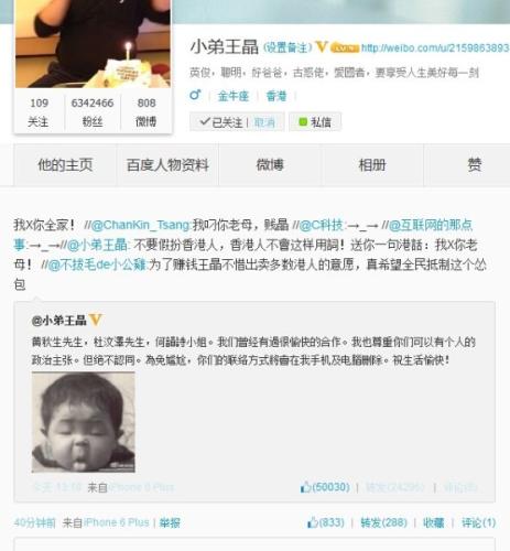 10月15日至16日,香港导演王晶发多条微博,借助香港“占中”事件阐述自己的政治主张。16日下午,王晶又说:“我向来不问政治,甚至不是选民。但我和太太决定登记,下一次立法会选举,我会鼓励尽量多和我一样的人去投票。用手中票把这些汉奸泛民赶出去,不能譲他们再教坏年轻人,毒害香港了!你们已经惹怒真正沉默的一群了! ”在之后的一条微博里,他更是扬言与自己政见不同的黄秋生杜汶泽何韵诗决裂:“黄秋生先生,杜汶泽先生,何韵诗小姐。我们曾经有过很愉快的合作。我也尊重你们可以有个人的政治主张。但绝不认同。为免尴尬,你们的联络方式将会在我手机及电脑删除。祝生活愉快! ”