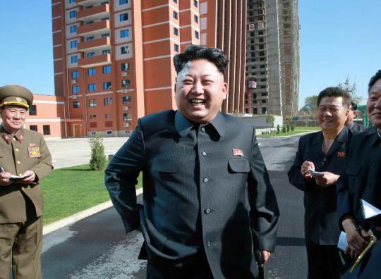 朝中社称,金正恩望着两栋46层公寓高兴地说,“公寓犹如浮在大同江上的帆船。外墙还盖上热线遮护玻璃,真漂亮。”