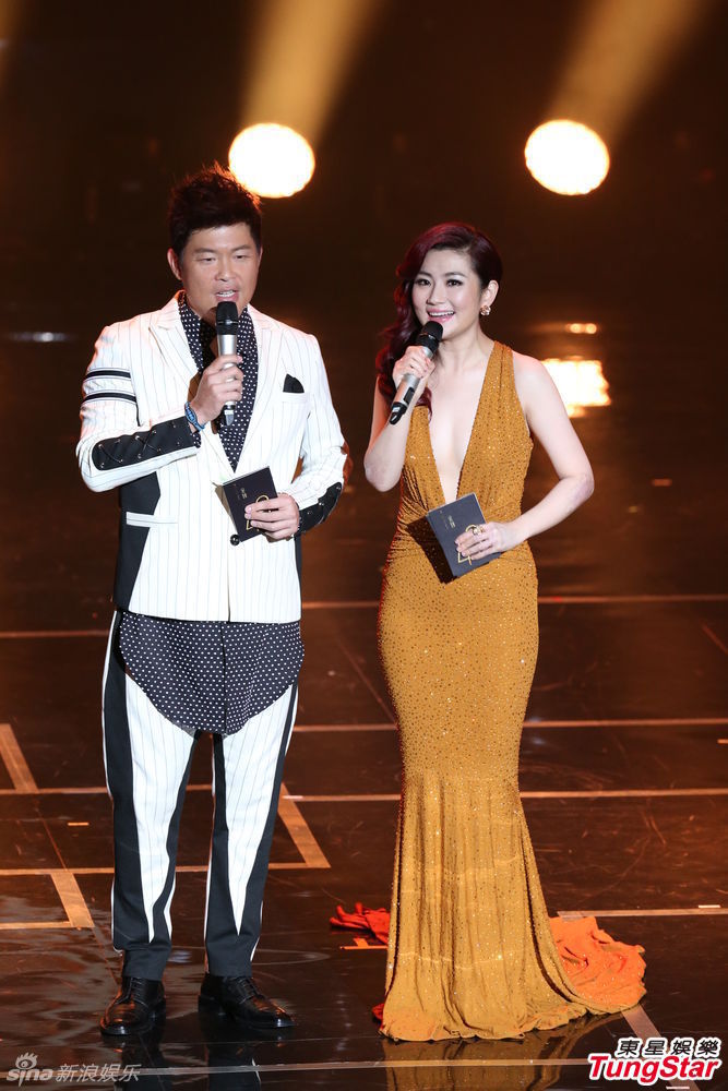 新浪娱乐讯2014年第49届台湾电视金钟奖颁奖典礼于10月25日晚举行,图为主持人曾国城携selina登台。Tungstar/图。