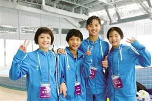 昨天,温州队(左起:金子晰、林亦晨、张语轩、陈欣彤)获得女子10岁组4×100自由泳接力冠军。 苏巧将 摄