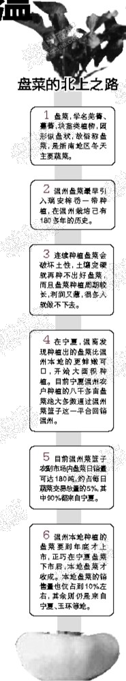“现在到年底期间上市的盘菜90%都来自宁夏。”据温州菜篮子农副市场相关负责人介绍,市场内五六个盘菜经营大户均为温州人,主要来自永嘉和瑞安,在宁夏也有自己的盘菜种植基地,自产自销,每年7月播种,9月后陆续收获,然后专程发往温州菜篮子农副市场进行批发销售。据了解,盘菜盖上沙子,可以储存一个多月,因此长途运输对盘菜的耗损并不大,目前市场内盘菜日销量可达180吨,约占每日蔬菜交易总量的5%。而温州本地种植的盘菜要到年底才上市,“正巧在宁夏盘菜下市后,本地盘菜才收获,打了一个时间差。”但该负责人也表示,即便是到年底,本地盘菜的销售量也仅占到10%左右,其余则仍是来自宁夏、玉环等地。