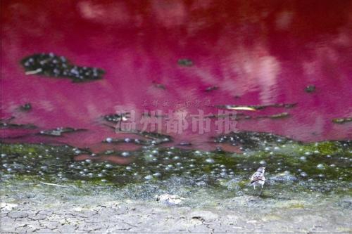昨天,市区黄龙康园小区内,一只小鸟在变红的河水边驻足。 温都记者 王诚/摄
