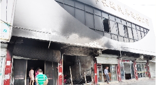 记者在现场看到,一楼两间店面已烧得一片漆黑,公司大楼二楼外墙也被熏黑,玻璃碎裂,但二楼内部没有被烧到。在该公司保卫科上班的陈贤顺说,起火时他刚在公司路边巡逻,看到浓烟从一楼店面内滚滚而出,他马上拿灭火器灭火。“大约过了3分钟,消防车就赶到了,火势很快被扑灭。”
