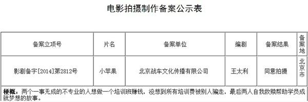 现在,这首《小苹果》将趁势被拍成电影了!在最新一期的电影立项备案公示中,由筷子兄弟之一王太利编剧、北京战车文化传播有限公司备案的影片《小苹果》赫然在列。而其剧情梗概则为“两个一事无成的不专业的人想做一个培训班赚钱,没想到所有培训费被别人骗走,最后两人自我救赎帮助学员成就梦想的故事”。