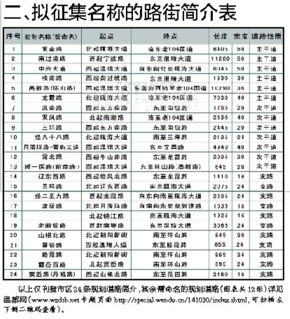 以上1号方案图仅刊登市区24条规划道路,其余需命名的规划道路(图表共12张)详见温都网(www.wzdsb.net专题页面http://special.wendu.cn/141030/index.shtml,可扫描左下侧二维码查看)。
