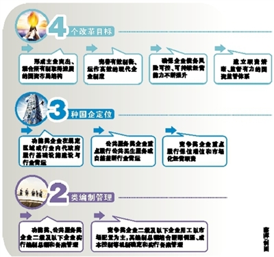 首先是按照资产属性和业务类型对国有企业进行划分,分类明确企业改革方向,实现差异化管理。这三类分别是:功能类企业在规定区域或行业内代政府履行基础设施建设与行业营运;公共服务类企业重点履行公共民生服务或自然垄断行业营运;竞争类企业重点履行保值增值和市场化经营职责。根据企业发展阶段,企业分类可适当调整。对涉及跨区域类别的企业,可按企业实际实施分层分类管理。