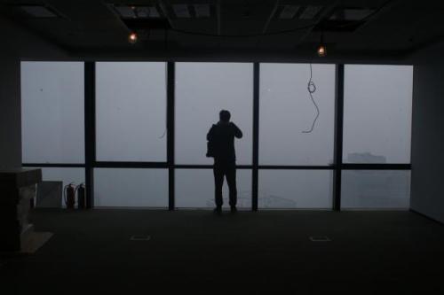 2014年10月9日,北京,国贸桥附近一处正在装修的写字楼内,窗外陷入了一片白茫茫的霾中。 澎湃新闻记者 权义 图