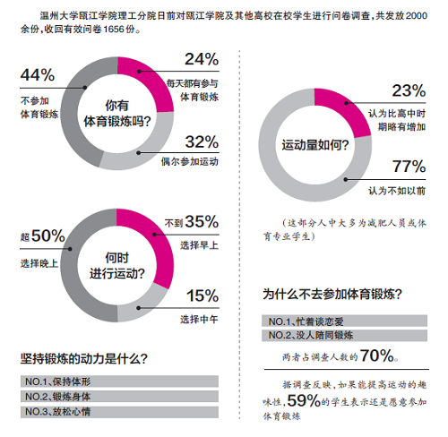 温州大学瓯江学院理工分院管理与服务中心主任金锡标说,大学管理相对宽松,对在校大学生的体育锻炼没有硬性要求,这就导致学生不爱体育锻炼,“宅男”、“宅女”越来越多的情况。