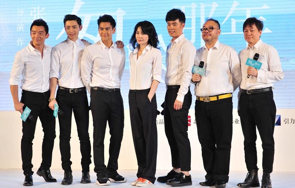 为何配合电影的校园主题,王菲身穿白衬衣、黑裤子和有荧光色logo的板鞋,俨然化身“高中女生”。当天王菲心情相当不错,脸也圆了一些,不仅大方和四位男主演摆pose拍照,还“开金口”和四人互动。