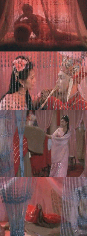 说到这,介绍的也差不多了,回归床戏话题。也许您会疑问,《西游记》还有床戏?当然!在86版西游女儿国那一集中,女儿国太师深夜领着唐僧去看国宝,沙和尚还疑问“这葫芦里卖的什么药?”孙悟空坏笑着回答“这就要看师父的道行了”。果不其然,唐僧看到的国宝是什么?躺在床上的女王!粉色纱帐轻飘,唐僧吓得眼都瞪大了,妹妹的眼也瞪大了。然后女王巴拉巴拉说了一大推要双宿双栖的话,想把御弟哥哥拐床上,在拉拉扯扯中,唐僧一不小心歪倒在床上,女王继续诱拐“今夜良宵难得,你就答应了我吧”,暧昧的气氛露骨的台词,一切刚刚好,结果在清心寡欲唐僧快要把持不住堕入凡尘时,被电灯泡琵琶精捉走了......