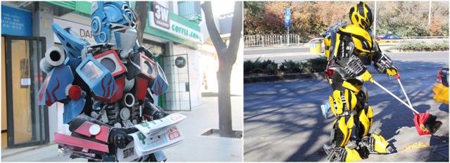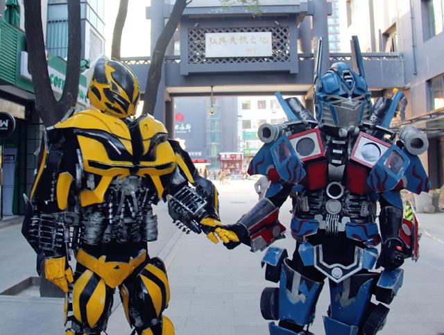 腾讯娱乐讯近日“大黄蜂”、“擎天柱”穷游北京的新闻迅速在社交媒体上走红,事件起因于11月2日中超收官战前,两位“天外来客”来到了工人体育馆前为北京国安呐喊助威,迅速引来球迷驻足围观,并有不少球迷冲上来“抱住”变形金刚留念,为现场紧张的争冠气氛带来了一丝欢愉。而后,两位变形金刚上演“机在囧途”,从三里屯“Village”到中关村海隆大厦再到东直门银座,扫大街、发报纸、送快递、煮咖啡等体力活儿是一样没落下,将苦命屌丝的生活体验到了极致。变形金刚“体验生活”期间,闪光灯几乎没有断过,人气火爆堪比偶像级明星。