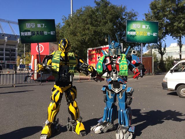 周日中超夺冠焦点战役,国安主场迎战河南建业,同时恒大客场挑战山东鲁能,这两场比赛结果直接关乎到冠军的产生。国安能否获得第二冠?赛前球迷状态如何?主场球票一票难求,已经是京城球迷给出最好的回应了。其中擎天柱、大黄蜂这对变形金刚球迷无疑是当日最亮眼的,激情伴着”基情“一扫秋风的”凛冽“,让比赛现场格外的温暖惬意。尽管比赛结果让不少球迷遗憾,国安没有取得最后的冠军,但是纵观整个赛季的表现,还是可以让京城球迷骄傲的。