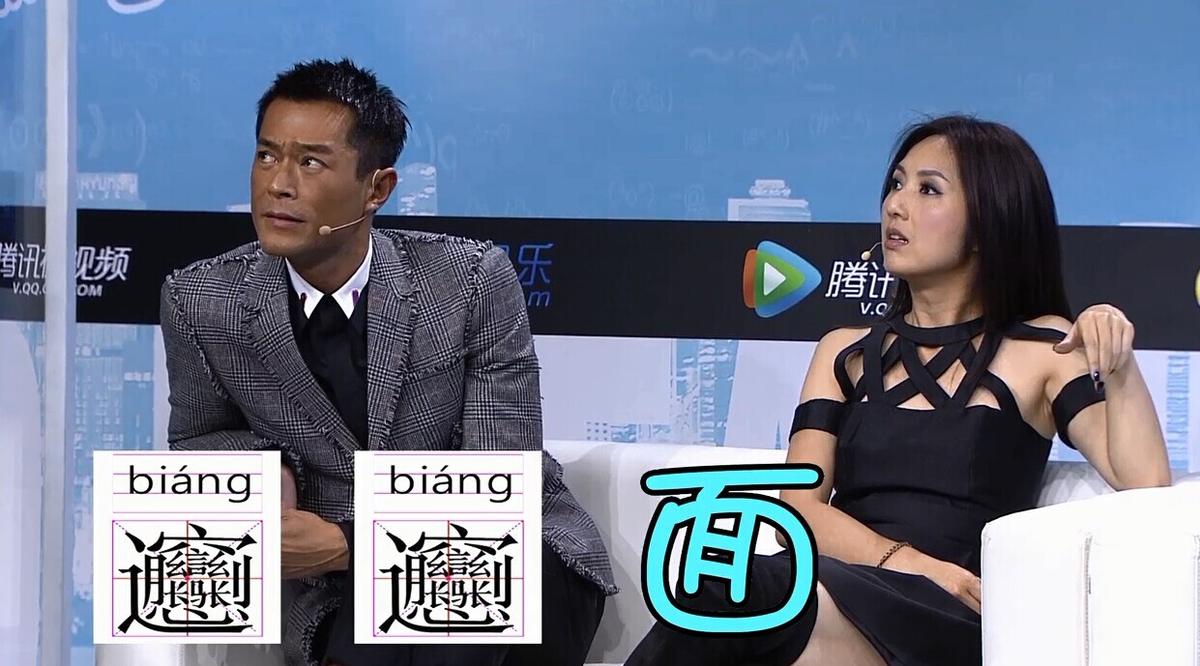 玩游戏玩输的高圆圆、周渝民这一组要贴的汉字就是它:Biang!(biang为合字,有多种写法,均无法输入电脑),这么难乃至于高圆圆拖着哭腔说,这真的要贴吗?真是无法接受这个事实。最终古天乐、杨千嬅一起上台帮忙,四人共同完成了这个最难汉字。