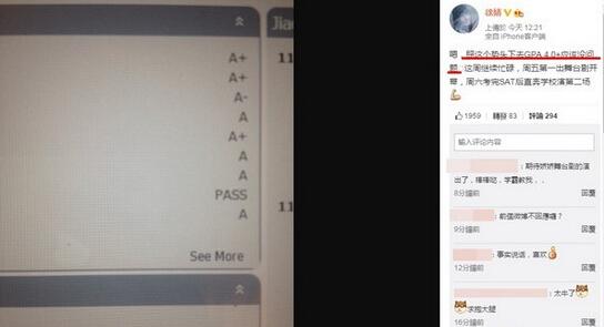 4日中午,徐娇在微博晒出成绩单的翻拍照,留言写下“照这个势头下去‘GPA 4.0+’(Grade Point Average,意即在校平均成绩)应该没问题”。