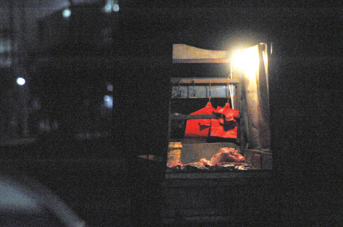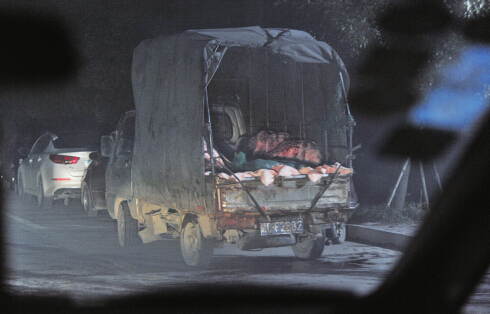这时候,只见一辆普通小型货车亮着刺眼的大灯,呼啸着开出了屠宰场的大门,车上堆满了猪肉,记者随即驱车跟上,货车开得飞快,没开多远,似乎发现被人跟踪,加快了速度,转眼便消失在黑夜中。