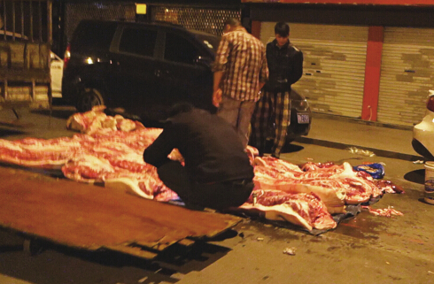 货车上的猪都被切成半头半头,共有20来头被放到蛇皮袋上,油脂和猪血四溢,不断有新的猪肉贩子来选购,看神情,他们和现代越野车司机都认识,双方交谈了几句,小贩就把猪肉往自己车上搬,所有人都没有戴手套,还时常有人往地上吐痰。