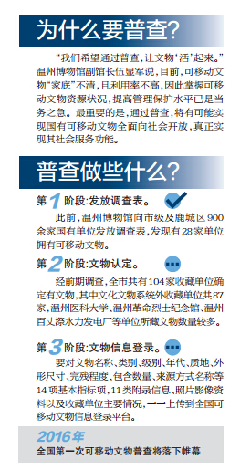 温州网讯 记者昨从温州博物馆获悉,截至11月5日,第一次全国可移动文物普查温州共上报文物(含自然类文物)7388件,完成收藏文物的18.03%,工作进度暂居省内第一,取得了阶段性成果。