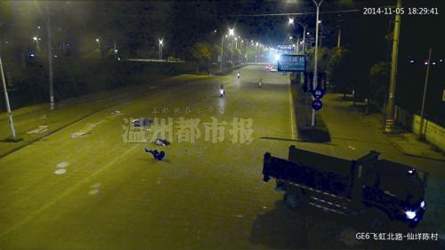 视频监控显示,当晚6时30分左右,一辆货车从乐清淡溪开往虹桥方向,途经飞虹路仙垟陈村路口时准备左转,一辆对向行驶的二轮电动车快速驶来,直接撞向货车右后侧。电动车火星四溅,车上两名男子撞上货车后被弹了出来,重重摔在地上,其中电动车驾驶员整个人被抛至空中,向后翻转一圈后滚落在地,电动车则被甩出十几米远。