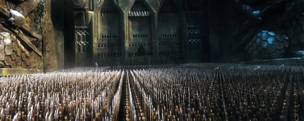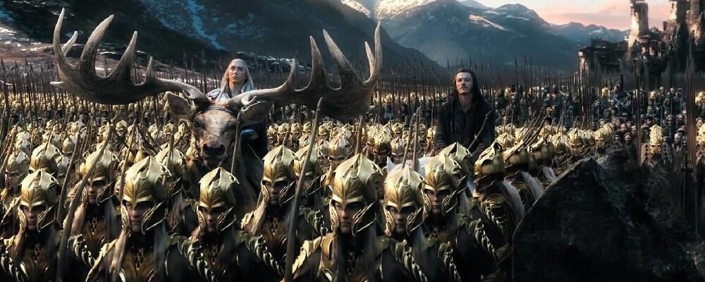值得一提的是,视频中战争场面、场景设计的气势恢宏,魔幻风格的极致体现,甚至超过以往的同类型影片,其中不听比尔博·巴金斯劝阻,要誓死捍卫孤山的“矮人王”索林和人类、精灵联军对峙时的镜头便足以惊爆人们眼球,一望无际且装备精良的精灵大军齐刷刷的张臂拉弓,漫天盖地的箭矢密密麻麻的向孤山飞去,这座矮人的堡垒上空如同被乌云所笼罩,不禁让人为其中孤立无援的索林捏了一把冷汗。