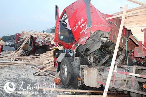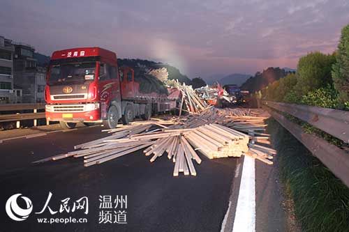 后车所载的木条洒落一地,造成往温州方向高速公路被迫关闭