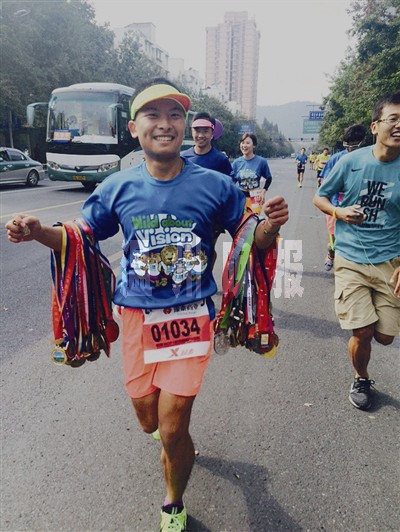 温州网讯 一个偶然的机会,他报名参加了杭州国际马拉松赛,咬牙跑完全程后,他获得了组委会颁发的一枚精致的完赛奖牌,奖牌上西湖三潭印月的图案非常漂亮,从此开始了他热爱的“跑马”生涯——三年跑了100场马拉松,在全球40多个国家以及祖国大江南北留下足迹——不求成绩,只求完赛,收集各种完赛奖牌。