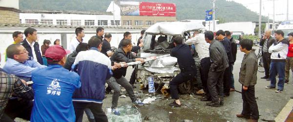 民警到达现场时,120救护车已在现场准备就绪,但因为金某腿部被卡在驾驶室中不能动,医生只能对他进行简单的头部包扎治疗。现场群众也纷纷找来工具,想对驾驶员实施援救,而驾驶室中不时传出阵阵痛叫声,场面十分惨烈。民警随即进行仔细检查,根据两车碰撞位置来看,发现可以先把货车移开,然后开展救援。民警立刻组织现场群众固定住七座,并要求货车驾驶员姚某驾驶货车后退,同时安抚金某。