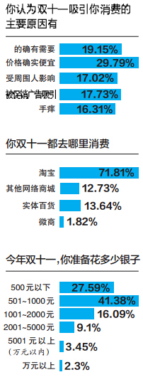 在问及“双十一吸引你消费的主要原因”中,参加调查的近两成受访者表示是因为手痒。林小姐平时就包裹不断,在去年“双十一”,她下了近十单。事后,她觉得自己很有反省的必要:“我买了三瓶卸妆水,寄到后发现家里还有2瓶,可看着价格比平时低,不买又手痒。”她说,当天她在网上一遍又一遍地逛,一直犹豫要不要买,心想都逛了一天没点收获不划算,就下单买了。