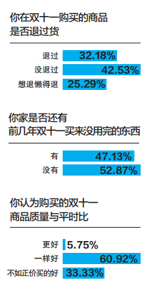在调查中,超过半数的受访者表示为“双十一”购买的商品办理过退货或是想要退货;超三成受访者认为“双十一”买到的商品质量不如平时的。一位受访者在去年“双十一”网购了两双雪地靴,寄到后发现都有瑕疵,但客服表示这是正常现象,如果不满意可以办理退货;另一位受访者在调查中表示,他从某知名品牌网店购进两套睡衣,但均已发霉发黄,商家表示是库存积压所致。