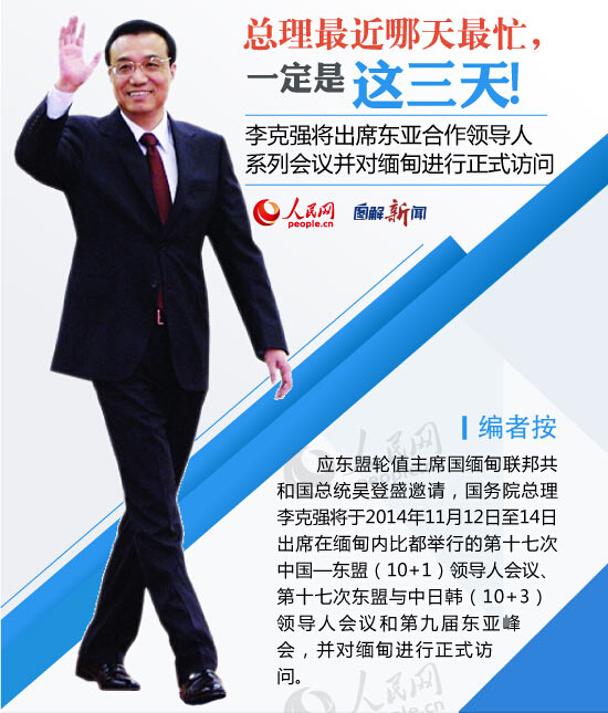 应东盟轮值主席国缅甸联邦共和国总统吴登盛邀请,国务院总理李克强将于2014年11月12日至14日出席在缅甸内比都举行的第十七次中国—东盟(10+1)领导人会议、第十七次东盟与中日韩(10+3)领导人会议和第九届东亚峰会,并对缅甸进行正式访问。