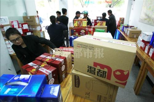 昨天下午2时多,一辆装满“温都猫”商品的货车进入新城站。“货到了。”站长陈先生在门口喊了一声,穿着深蓝色工作服的8名快递员疾步走到货车边,开始将货搬进店内,随后原本空荡的几张大桌子上迅速堆满了箱子。