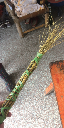 徐女士用于抽打婷婷的竹梢鞭,是一小捆干枯细竹枝,用绿色丝带捆住手柄,类似一把小型笤帚,在当地农户家中较为常见。在打的过程中,有附近邻居过来劝,后来徐女士就回到屋后洗裤子了。