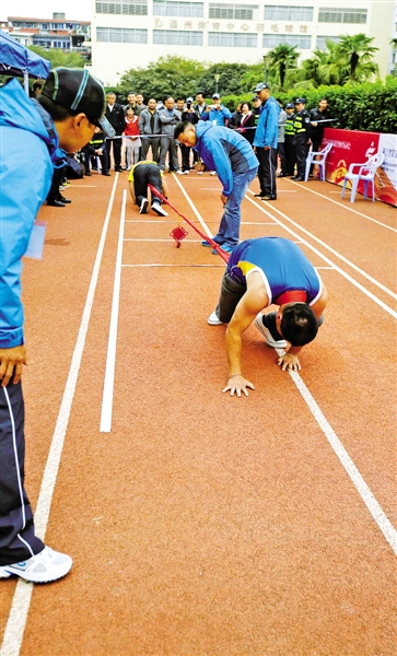 昨日是第五届浙江省少数民族传统体育运动会的第二天,射弩、珍珠球、押加、秋千等项目依旧竞争激烈。图为选手在市体育中心进行押加比赛。 刘伟 摄