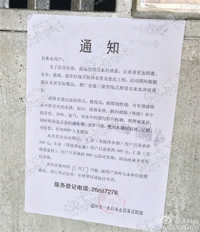温州网讯 家住温州市区水心住宅区的胡先生昨日反映,自家防盗门上多了张通知,称“为提高用水质量,我单位现开展净水普及惠民工程,推广安装厨房自来水净化设备。”他表示,由于底下的落款是“温州市一水自来水设备直饮部”,看起来和自来水公司有关,但又无法确认真伪。