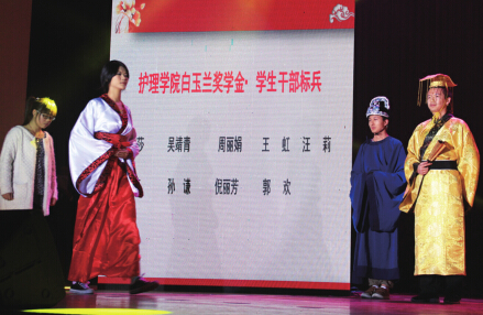 当晚,近百名护理学院优秀学子以这种“登科”的方式接受国家奖学金、校级奖学金、院级奖学金等颁奖。据悉,在这场奖学金颁奖礼还有个名字,叫“登科大典国学盛宴”的女子国学堂主题晚会,早在今年9月就已经开始筹备,近千名学生参与,台上颇有演员风范的“皇帝”和“礼部侍郎”就是由学生自行扮演。